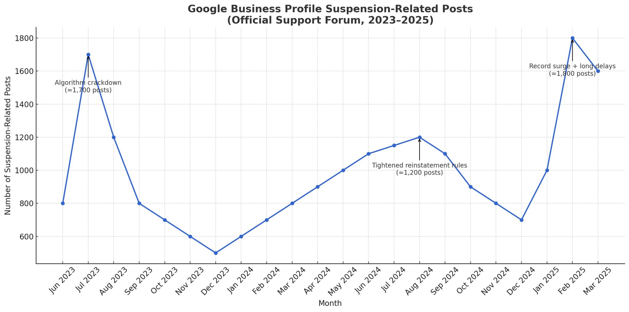Since 2023, there has been a sharp increase of Google Business Profile suspension related requests in the official support forum: