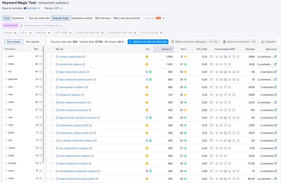 The Keyword Magic Tool is the go-to resource for uncovering local keywords. By adding Australian city names, suburbs, or regional terms into the “Include keywords” filter, you can find high-intent search terms like “plumber Bondi Junction” or “accountant Gold Coast”.